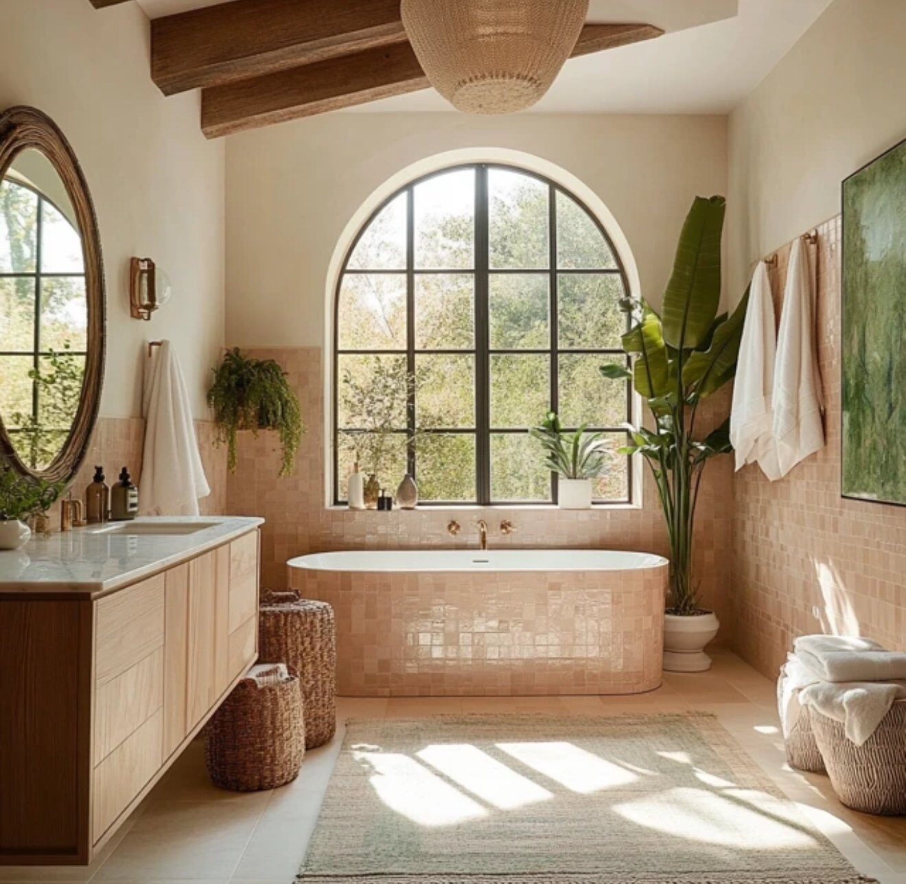 Arched windows, natural textures, and warm neutrals bring a touch of Mediterranean charm to this San Diego bathroom remodel. Sunlight spills across terracotta floors, a sculpted soaking tub, and handcrafted details. Designed for slow mornings and unhurried evenings, this bathroom invites you to relax, recharge, and escape—without ever leaving home.