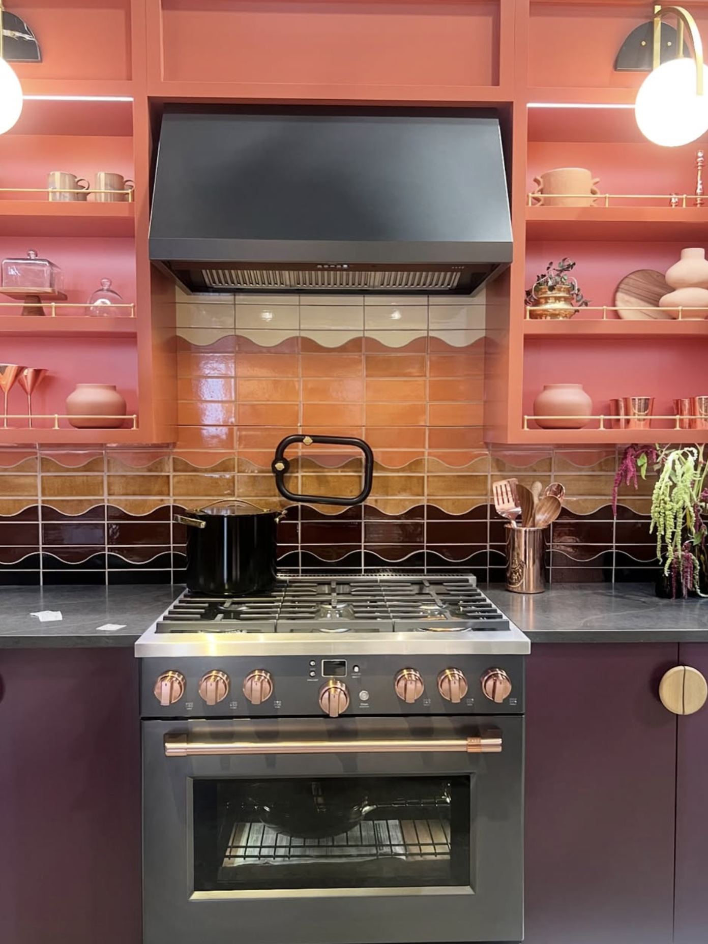 For years, neutral kitchens have dominated, but KBIS made it clear that color is back in a big way. Rich, moody hues like deep greens, navy blues, and terracotta brought personality and warmth to kitchen cabinetry and appliances. Café Appliances impressed us with their statement-making finishes, showing how color and metallic details can transform a space. They had stunning displays that blended soft pastels with rich pinks and purples, making it clear that pink still holds its power in the design world. One of the most striking pieces we saw was the Bertazzoni oven, a sleek yet timeless design that blends modern innovation with old-world charm.